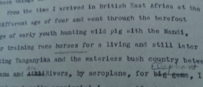 The problem with Schumacher’s claim is that one can’t easily resolve the issue by going to a handwritten manuscript. West with the Night‘s manuscript was typed, dictated to Schumacher by Markham (see the above photo). The only photograph I have found (from the Lovell biography) shows Markham offering clear handwritten edits. So there is little physical evidence to suggest that Schumacher was the secret pilot. We have only his word for it and that of the friends he told, who include Scott O’Dell. Trzebinski, who is the main promulgator of these rumors, is slipshod with her sources, relying only upon a nebulous “Fox/Markham/Schumacher data” cluster (with references to “int. the late Scott O’Dell/James Fox, New York, April 1987” and “15/5/87” — presumably the same material drawn upon for James Fox’s “The Beryl Markham Mystery,” which appeared in the March 1987 issue of Vanity Fair, as well as a Scott O’Dell letter that was also published in the magazine) that fails to cite anything specific and relies on hearsay. When one factors in an incredulous story that Trzebinski spread about her own son’s death that the capable detectives at Scotland Yard were unable to corroborate, along with Trzebinski’s insistence on camera in the 1986 documentary World Without Walls that only a woman could have written West with the Night, one gets the sense that Trzebinski is the more unreliable and gossipy biographer. And Lovell offers definitive evidence which cast aspersions on Tzrebinski’s notion that Markham was something of a starry-eyed cipher: