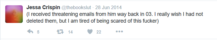 I have all of our correspondence going back to 2002. [Editor’s Note: This was a mistake. I communicated with a different “Jessa” in 2002 and it was in the same folder. My first correspondence with Ms. Crispin was in 2003.] Attached is a screenshot of one of our exchanges from 2003, pointing out how you “usually do keep copies of correspondence.” It is clear from my files that I never sent you any threats.