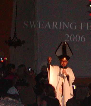The main center of action was up the staircase, where a screen projected various images of words. Not long after this an ecclesiastical figure appeared and proceeded to deliver a number of benedictions to the audience, concluding each passage with the words, “And I say….fuck that.”