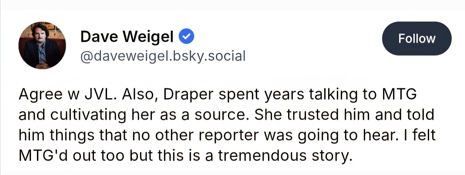 Access journalism has always been a line that I will never cross. I’ve done hundreds of interviews in my life and I’ve never agreed to prerigged questions. Normalizing fascists — in this case, following The New York Times’ greasy lead, is similarly a point on which I will never bend. (And I’ve turned down serious dinero that fuckheads like Last and Wiegel will lap up like demented six-year-olds scarfing candy down their corpulent gullets.) For Last and Wiegel, the betrayal of basic Fourth Estate principles represents a thrill that is as seminal as Laura Loomer dreaming about giving That Orange Sack of Shit a handjob under his desk as he is on the phone taking orders from Putin.