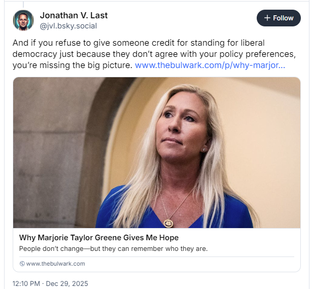 I kid you not. This is the remarkably gormless and highly gullible mouthbreather steering a sizable chunk of the “liberal” ship The Bulwark. He has, rather amazingly, not been given a banker’s box for his office possessions and a thorough ass-beating by a security guard. And the fool still holds onto his job. And on BlueSky, Last tried to have the last word by delivering this whopper: