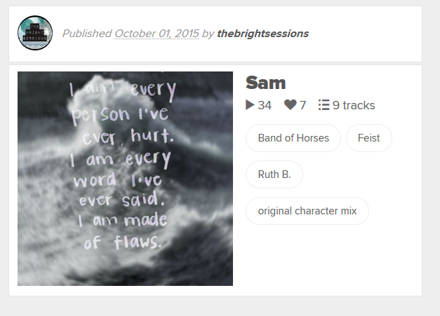 I don’t know what the music playlists revealed to the actors — that’s probably something I should ask them. For me, the mixes provide the general mood of the character; an energy. I listen to the mixes before writing the characters to get me in that mindset. It can also help me zero in on an overall theme within the character. For example, I built Sam’s whole playlist pretty quickly (she’s the character I voice so I know her very well) and afterwards I realized how much of the content had to do with the idea of “home.” That discovery told me a lot about the character and what was important to her.